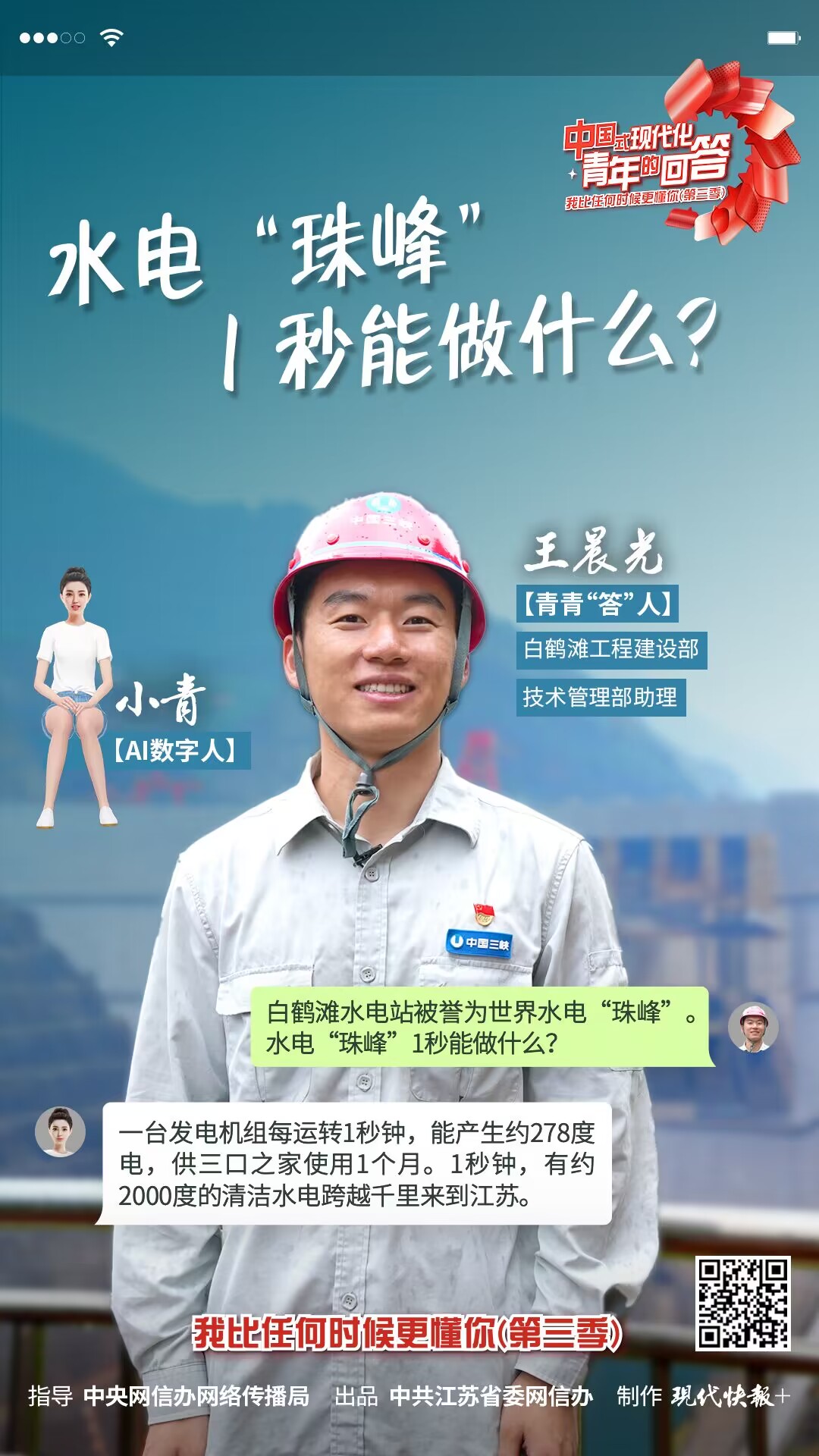 10月30日,“中国式现代化·青年的回答——我比任何时候更懂你(第三季)”系列短视频之《水电“珠峰”1秒能做什么?》正式上线。本集视频中,青青“答”人——白鹤滩工程建设部技术管理部助理王晨光和AI数字人小青带大家打卡了我国“西电东送”的超级工程白鹤滩水电站,讲述了水电站在建设中取得的光辉成就,以及建成后发挥的巨大效益。